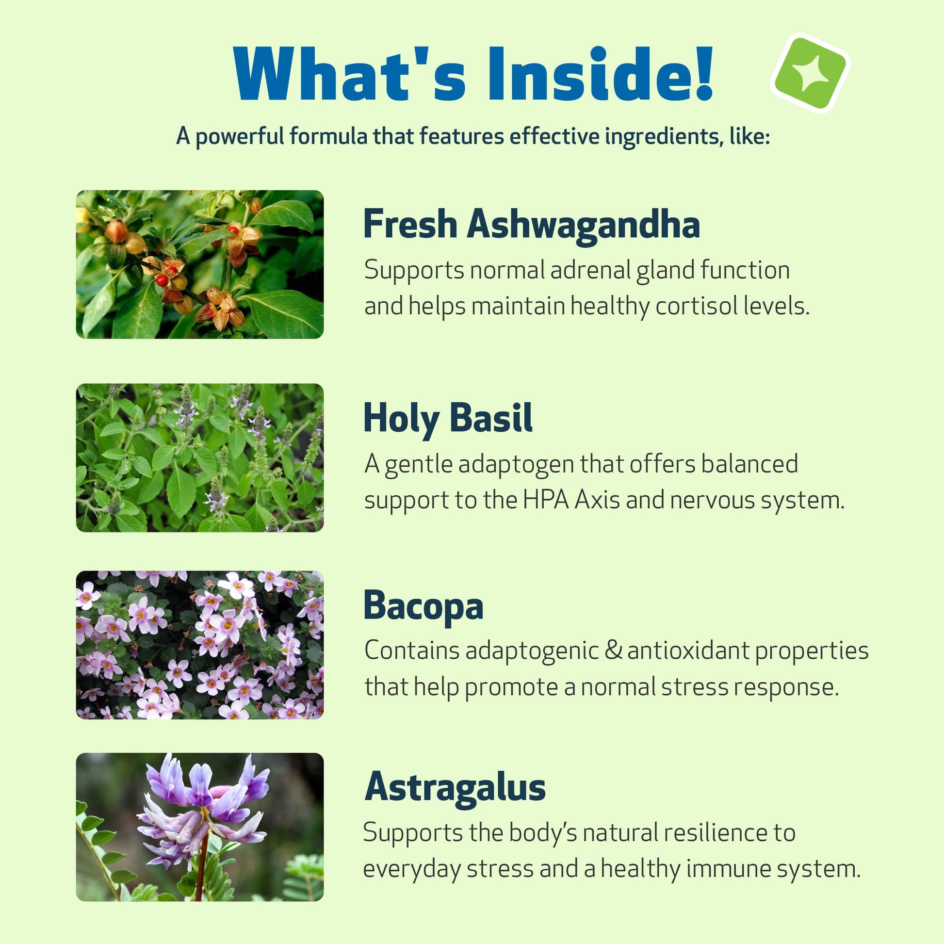 - Carefully selected, HIGH QUALITY HERBS, including Ashwagandha, Astragalus, Holy Basil & Bacopa.