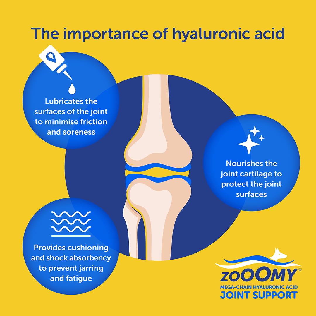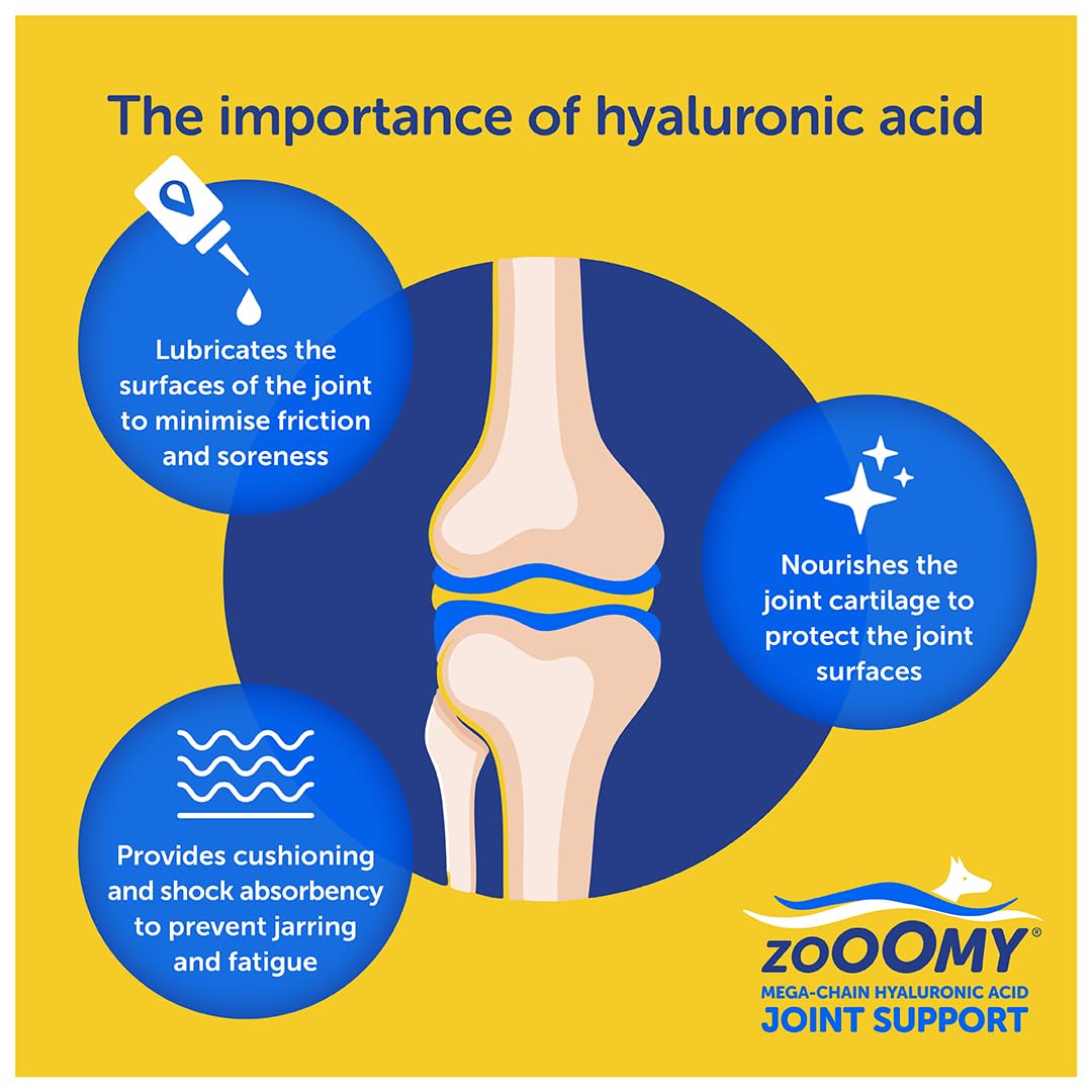 - LUBRICATES STIFF & SORE JOINTS - dog supplements supporting the quality of joint fluid, and hip & joint care for dogs, hyaluronic acid can be an ideal senior dog supplement and leg support for dogs