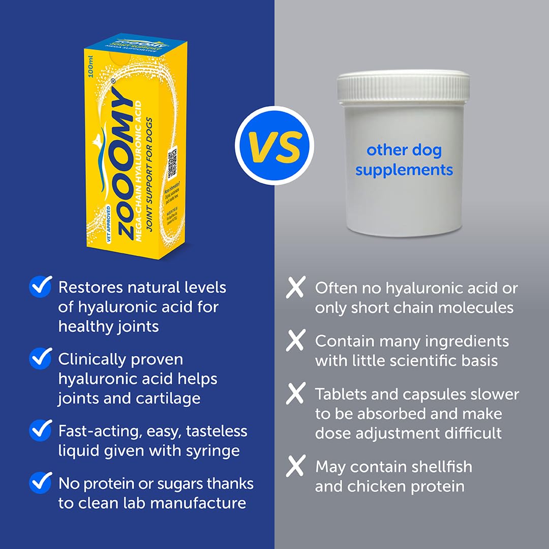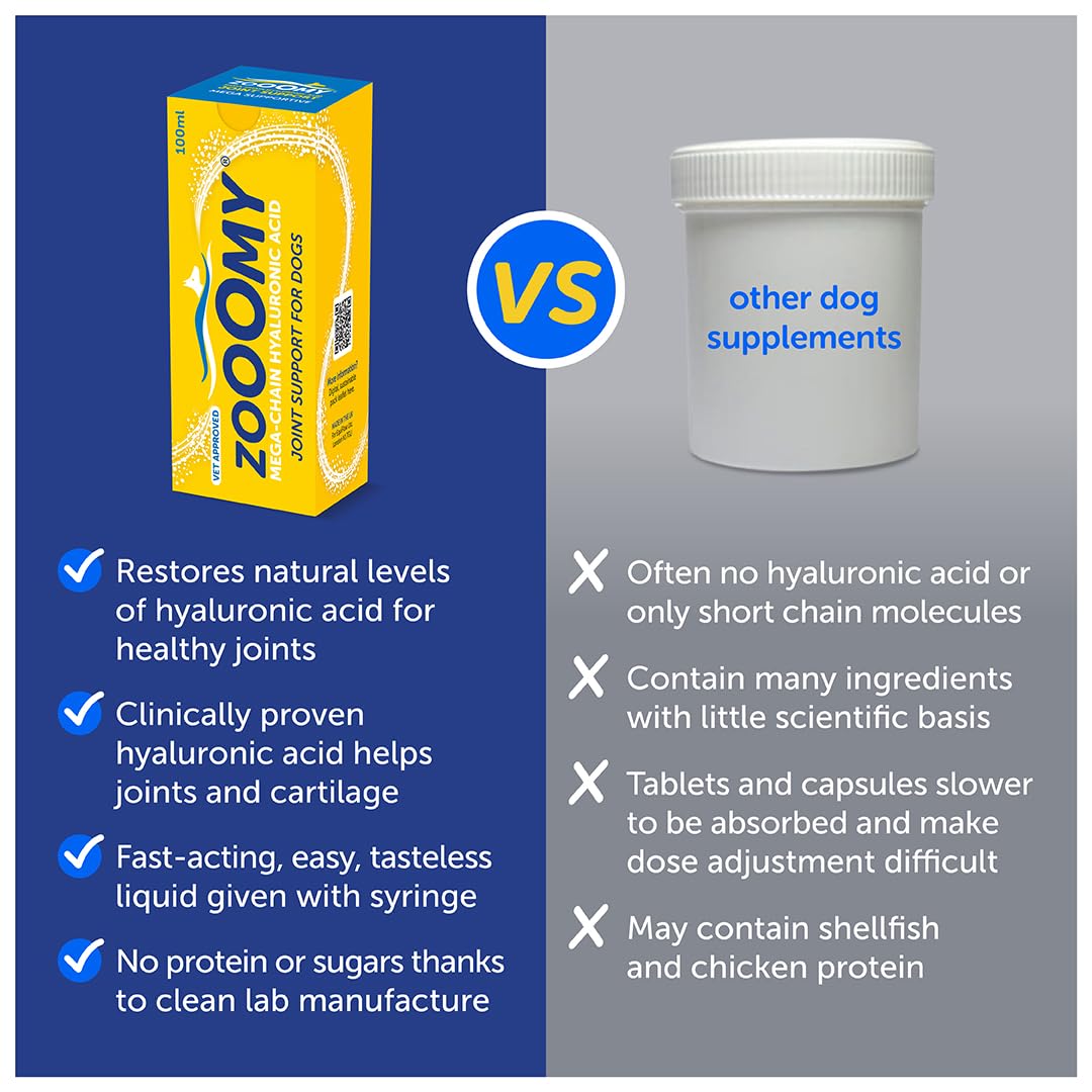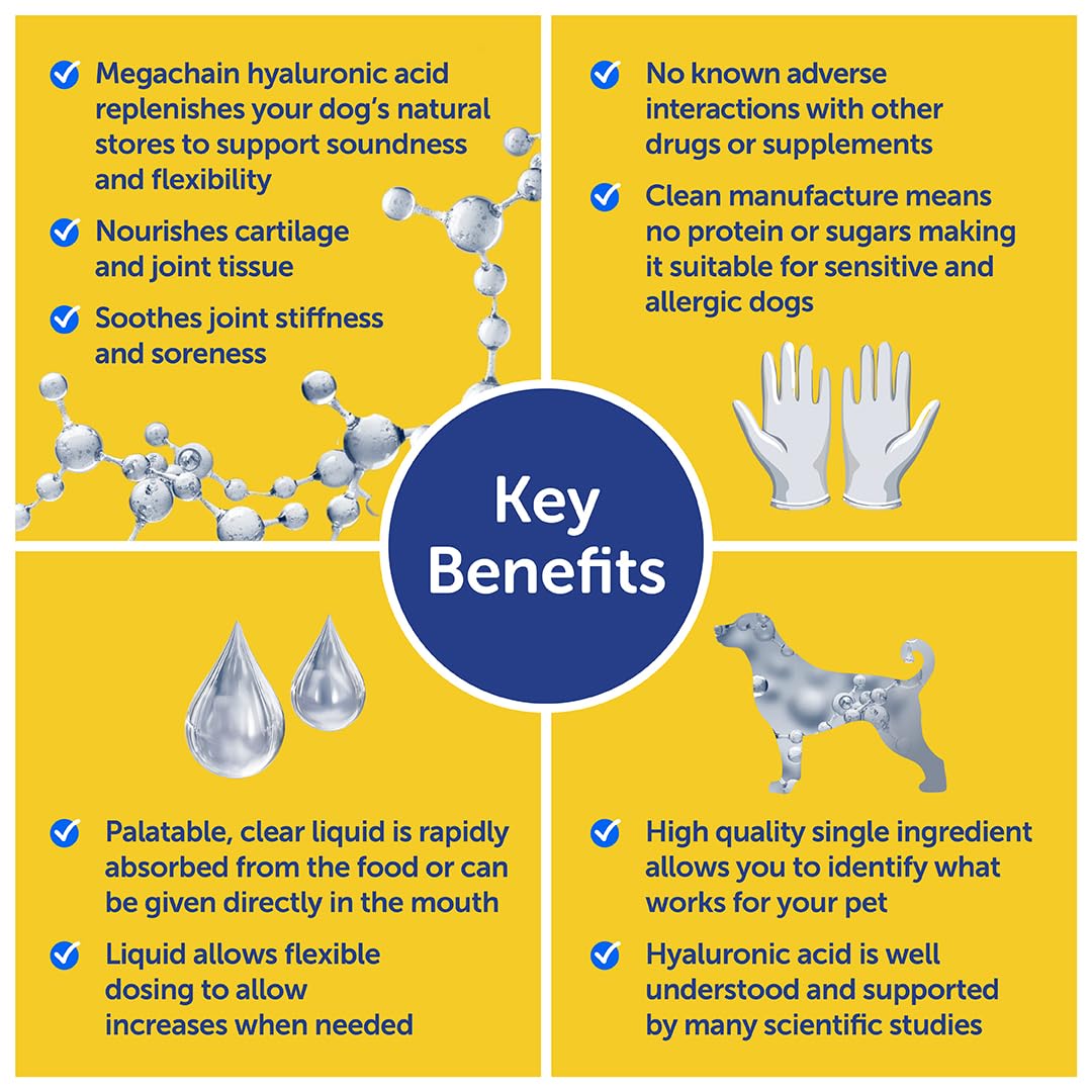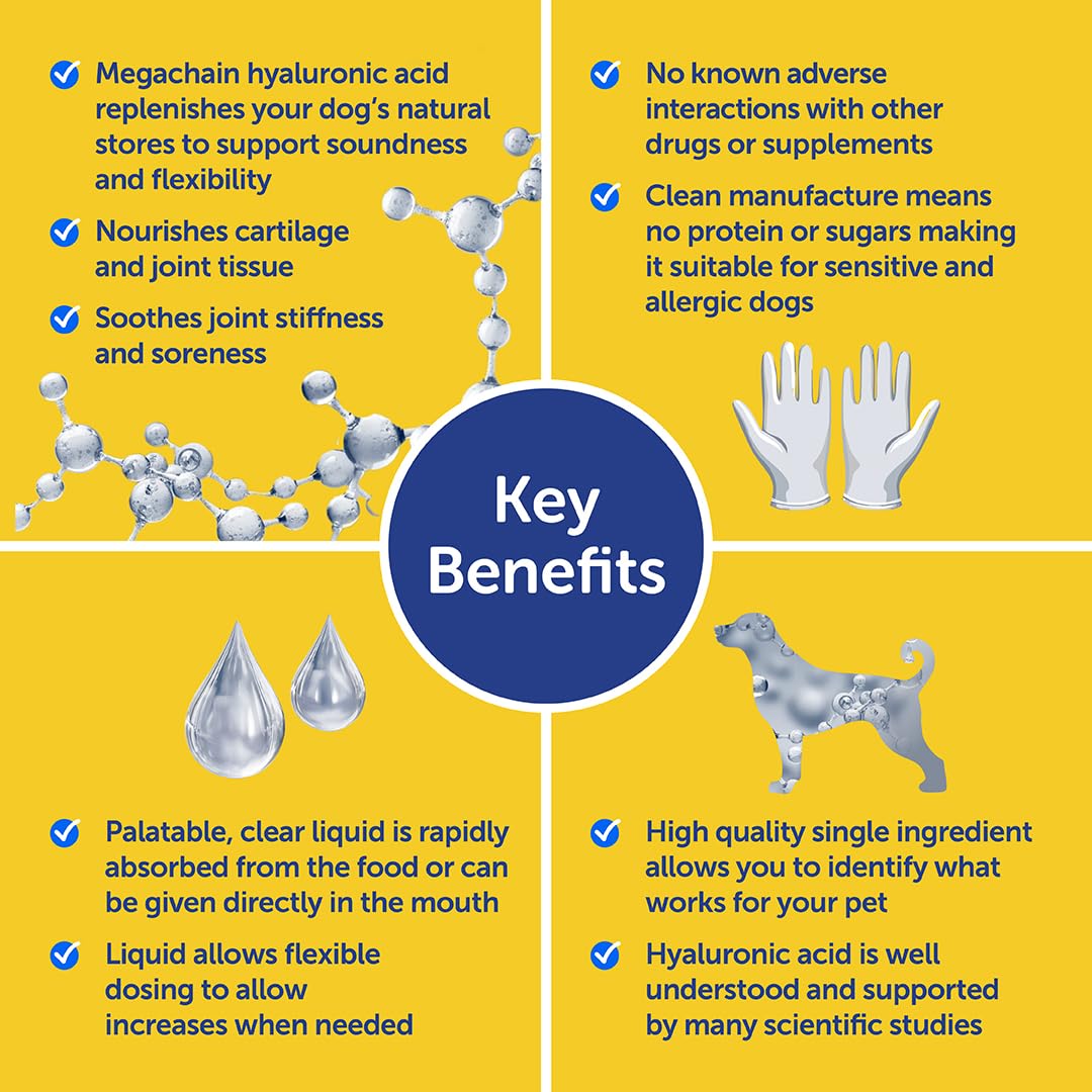 - COMPATIBLE WITH OTHER DOG JOINT SUPPLEMENTS FOR SENIOR DOGS - hyaluronic acid won't interfere with dog vitamins from your vet.
